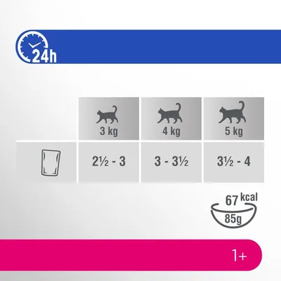 Un chat de 3 kg a besoin de 1½ sachet et de 15 g de nourriture sèche par jour, un chat de 4 kg a besoin de 2 sachets et de 15 g de nourriture sèche par jour, un chat de 5 kg a besoin de 2 sachets et de 25 g de nourriture sèche par jour.